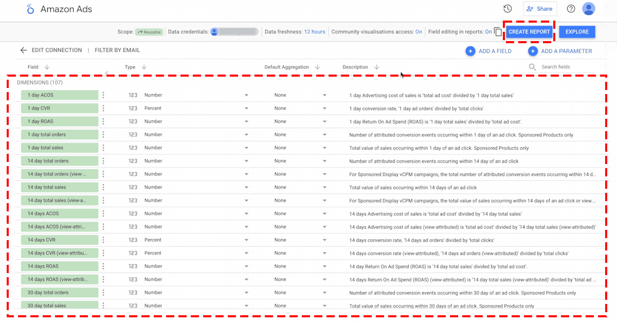 - The next window shows all the available Amazon Ads metrics, ready for the report. You can modify the metrics or click the Create Report button at the top-right corner.