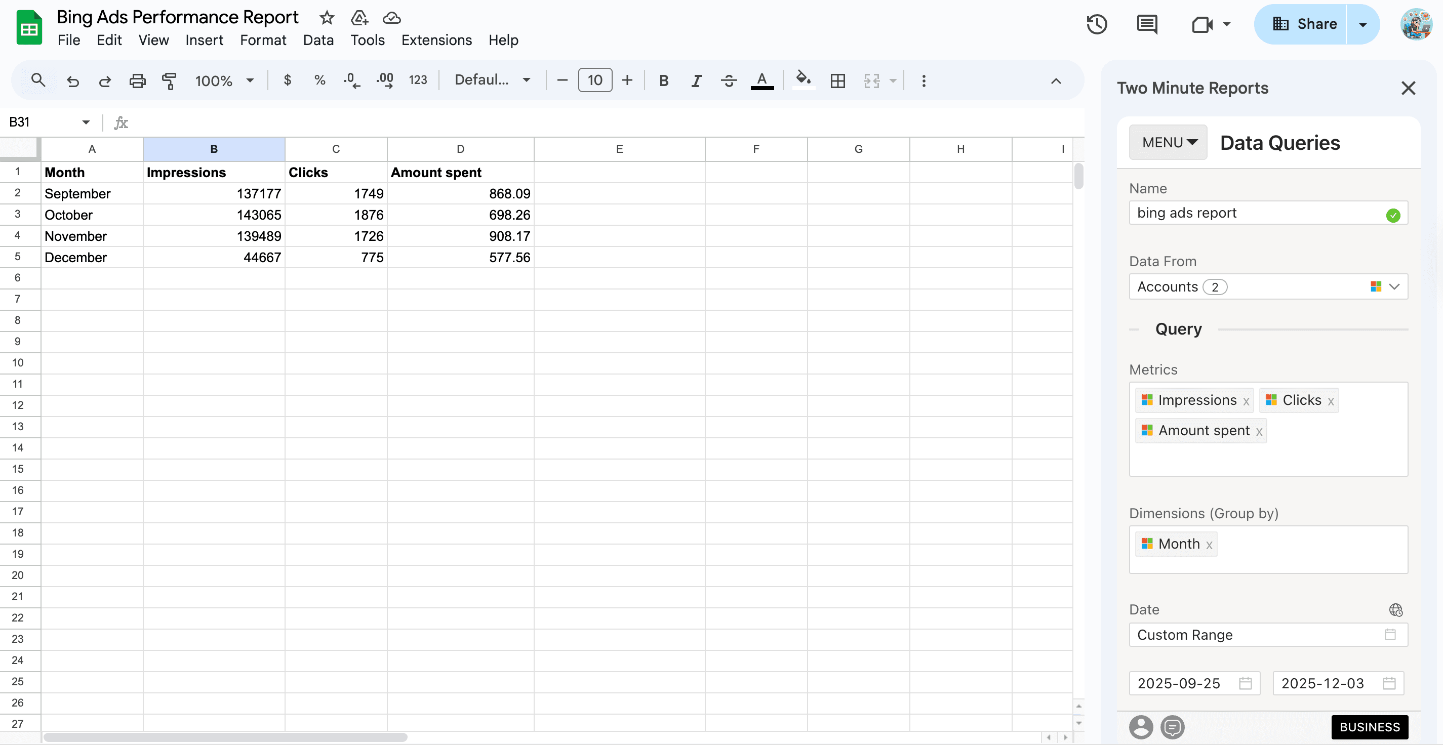 To get started, install the Two Minute Reports add-on from the Google Workspace Marketplace. After you have installed, you can connect Bing Ads to Google Sheets in the following methods: