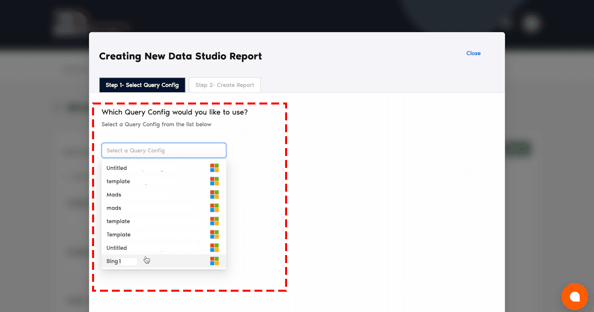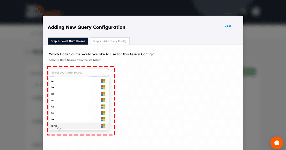 - From this window, choose the relevant previously created Query Config from the search bar and click the Next button.