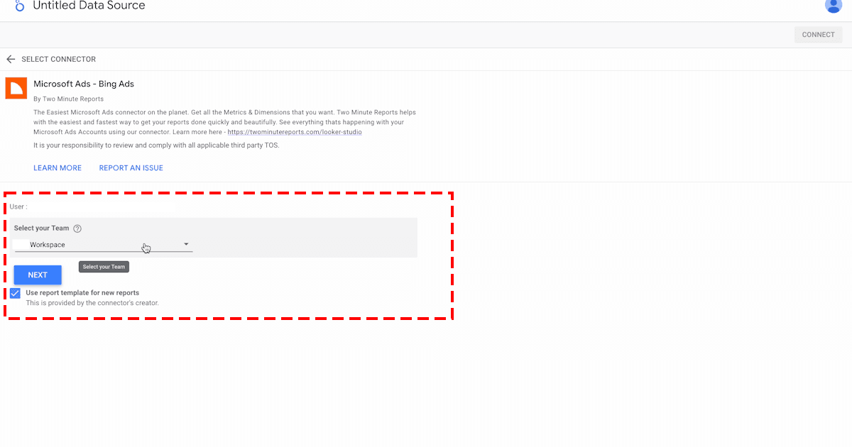 - Once Looker Studio opens, choose the relevant team. Ensure that “Use report template for new reports” is checked. Once you've done this, click on Next to continue.