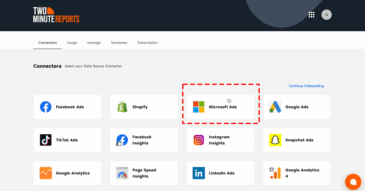- Choose the relevant data source connector from the connectors page. In this case, click on Microsoft Bing Ads. This will take you to the Bing Ads Connector Dashboard.