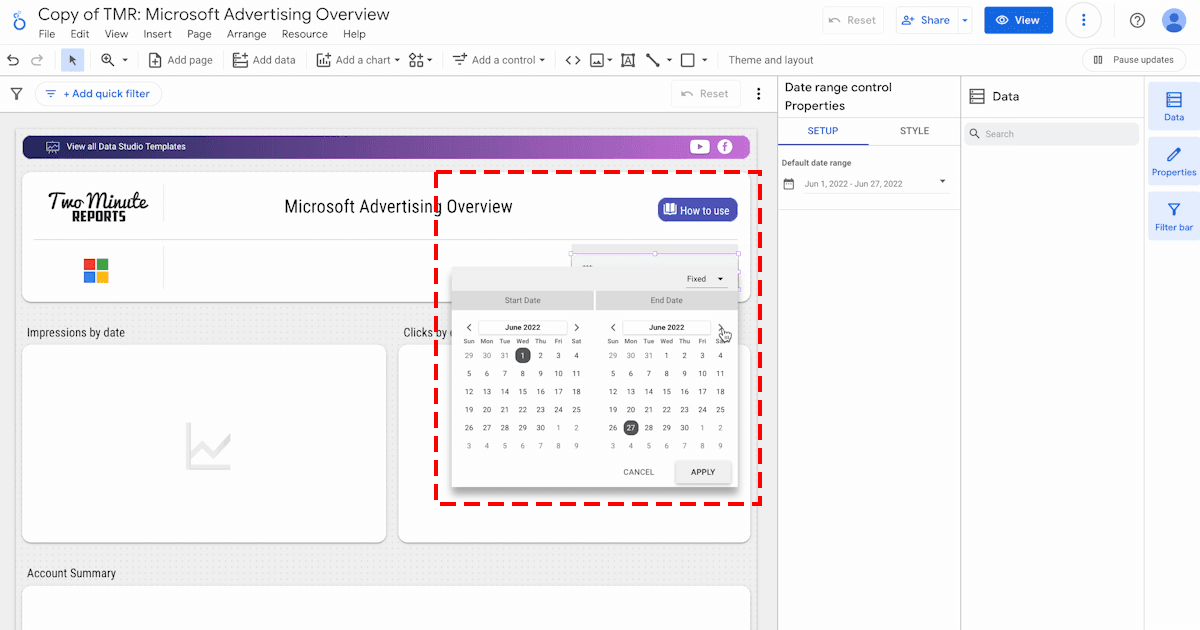 Looker Studio provides visualization and interactive dashboards that Bing Ads’ reporting suite lacks. Pair it with a third-party tool (like Two Minute Reports!), and you can visualize data easily and effectively with preset templates built for specific purposes.