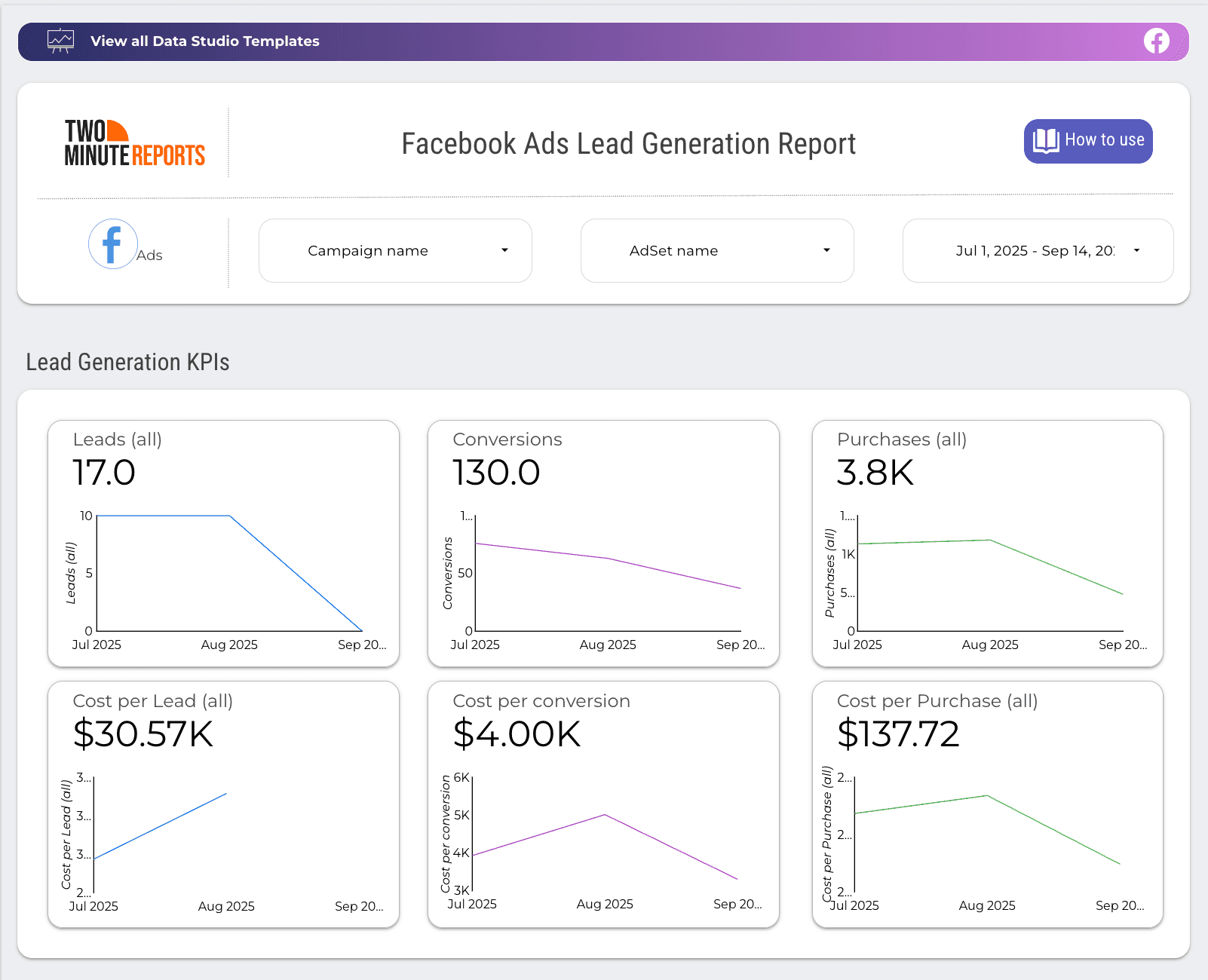 Install the Two Minute Reports Facebook Ads add-on from the Google Workspace Marketplace. Next, connect your Facebook Ads account to Google Sheets or Looker Studio. Then, select the pre-built templates for Facebook Ads or customize your own dashboard to track specific KPIs. Visualize automated, real-time updates for easy monitoring.