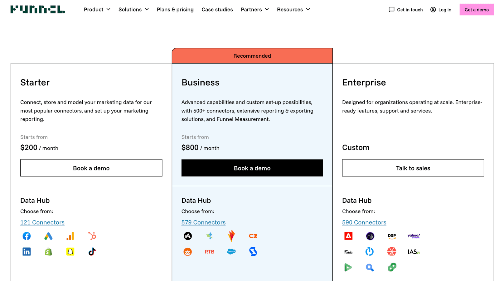Funnel’s Business plan costs around $800/month = $9,600/year, with Flexpoints that continue to scale as your connector count, destinations, and data volume grow. The $800 is the floor, not the ceiling.