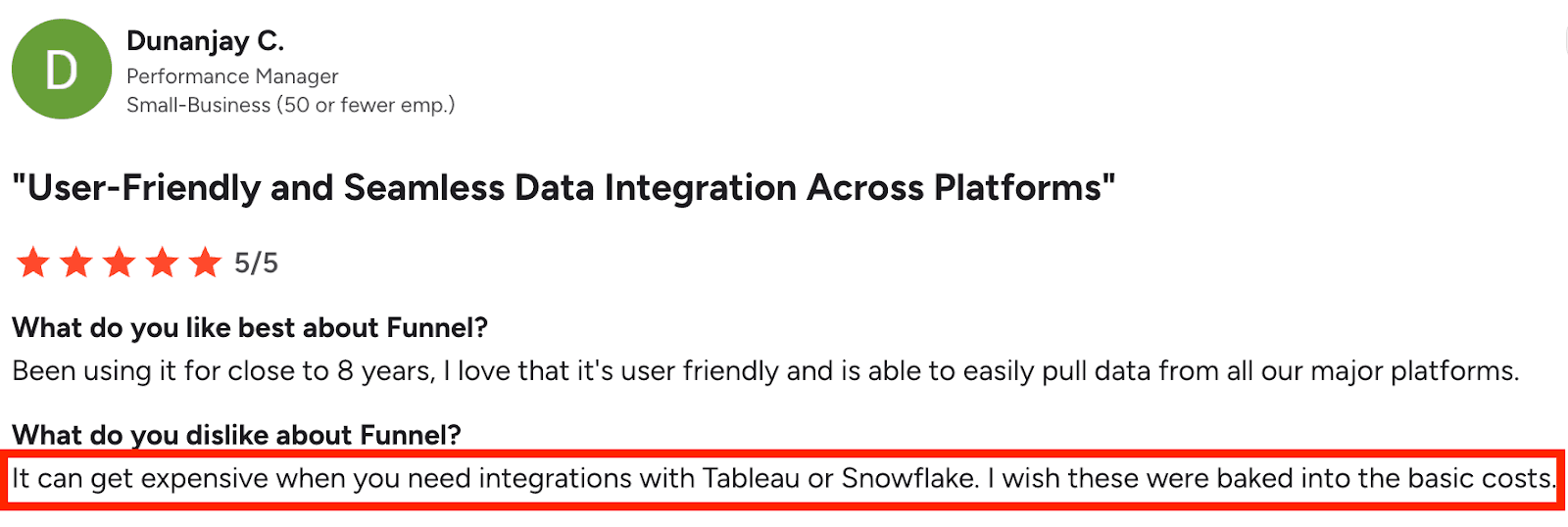 1. Visualization tools are not included: Funnel gets your data to Looker Studio, Tableau, or Power BI. What you do with it from there still comes at a cost, whether that is a paid license for the visualization tool itself, or the time and expertise needed to manage and maintain it.