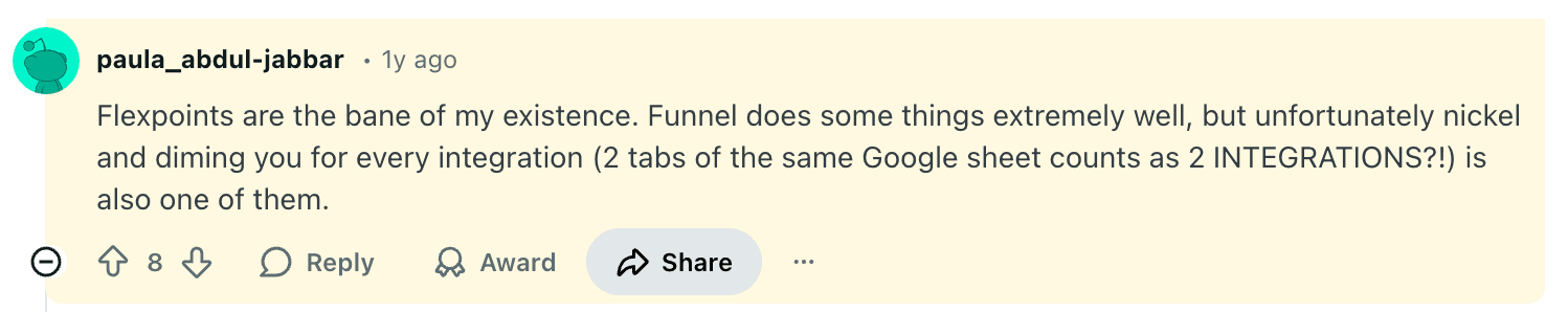 Funnel uses an internal credit system called Flexpoints, which is where predictable pricing becomes complex. Every action on the platform reduces your credits: