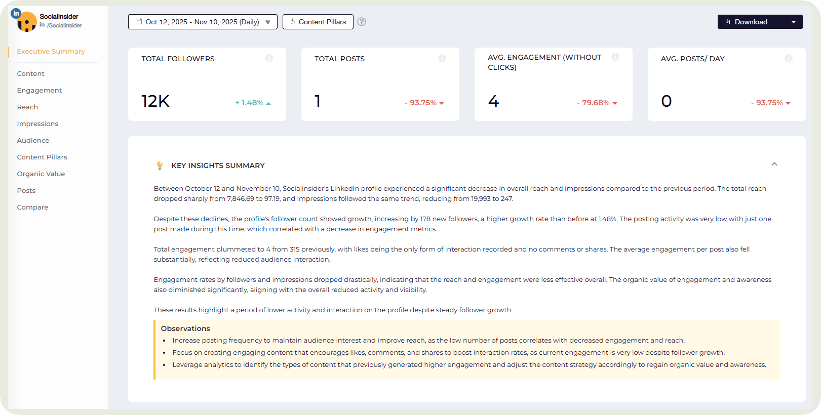 Image Source: SocialInsiderSocialInsider is a comprehensive LinkedIn analytics tool providing in-depth insights to optimize performance. It helps you track essential metrics such as page views, follower growth, post impressions, engagement, clicks and reactions, giving you a streamlined view of how your content is performing over time.