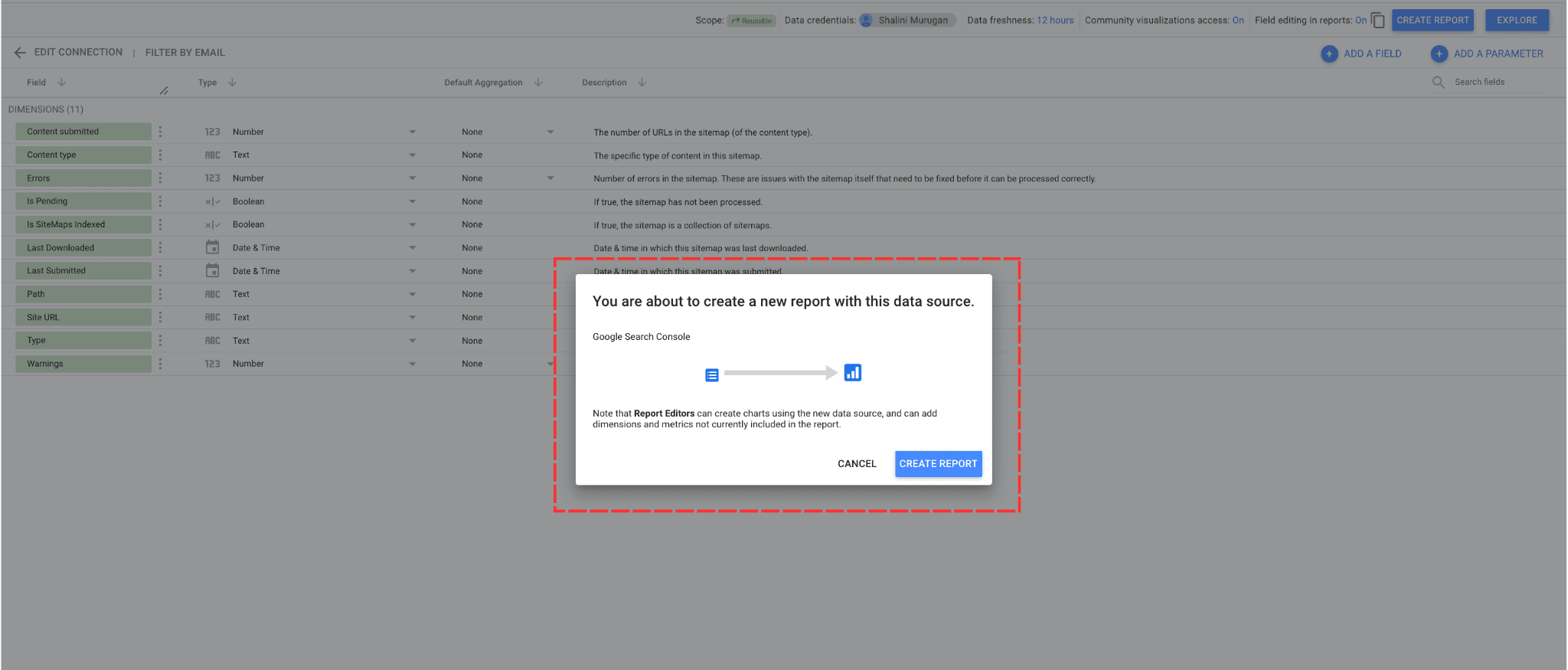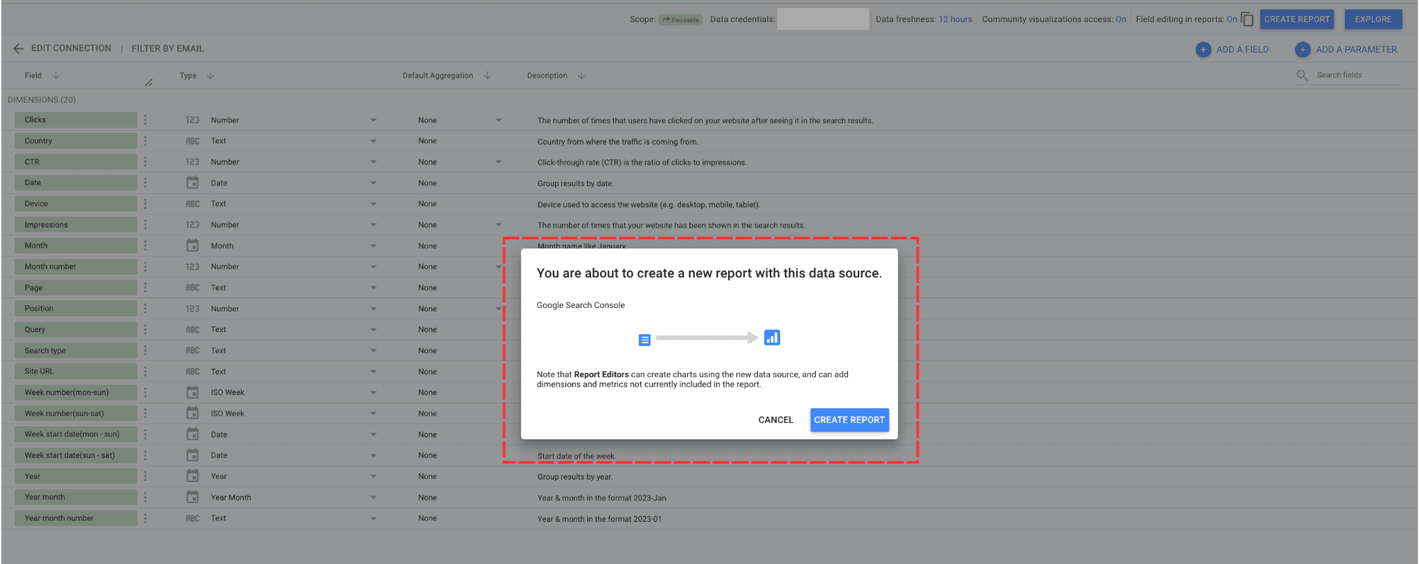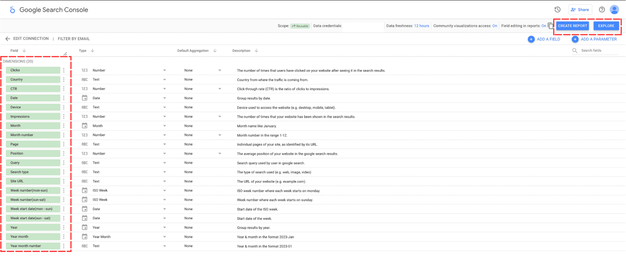 - The next window shows all the available Google Search Console metrics and dimensions, which you can include in your Looker Studio report. You can either modify the metrics or click the Create Report button at the top right corner.