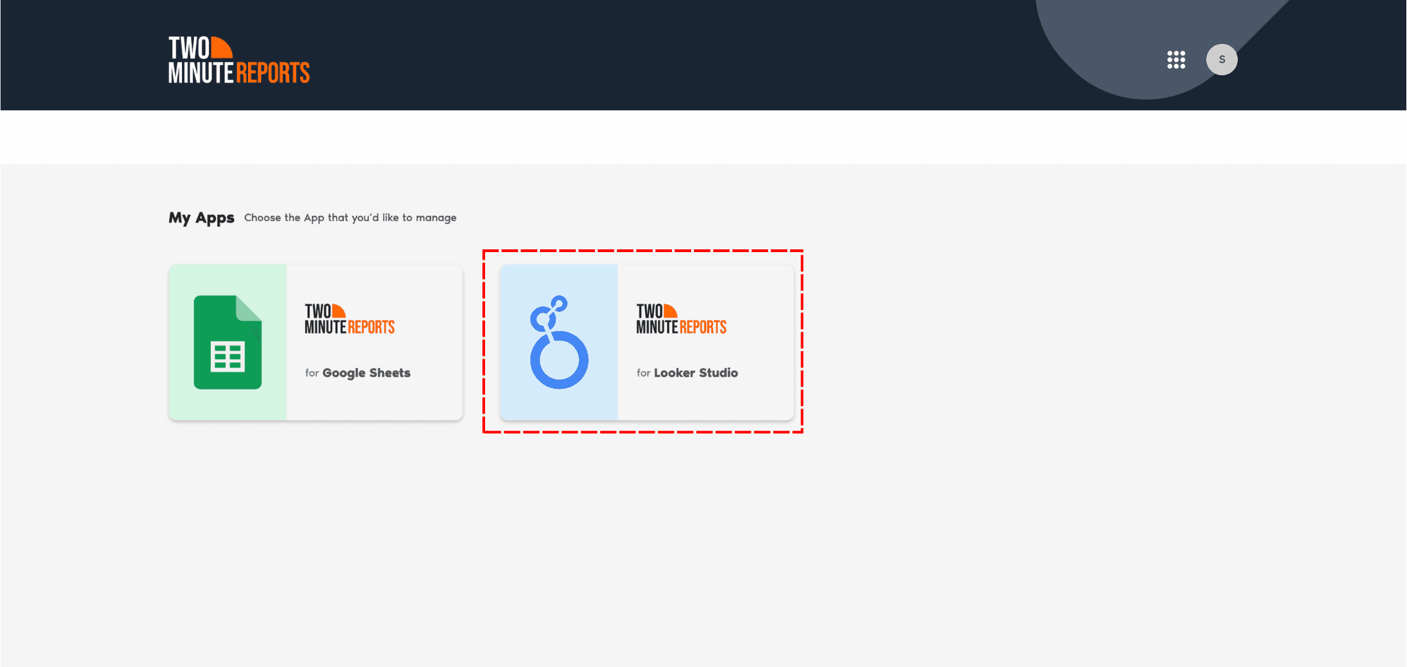- Once you’ve logged in, choose Two Minute Reports for Looker Studio from My Apps.