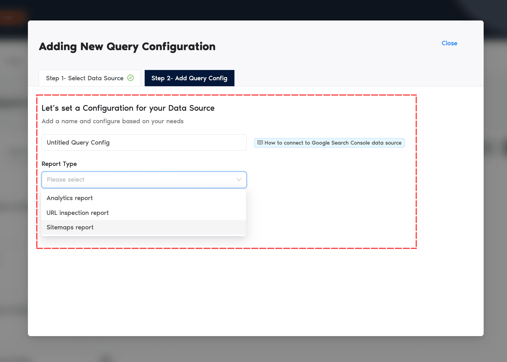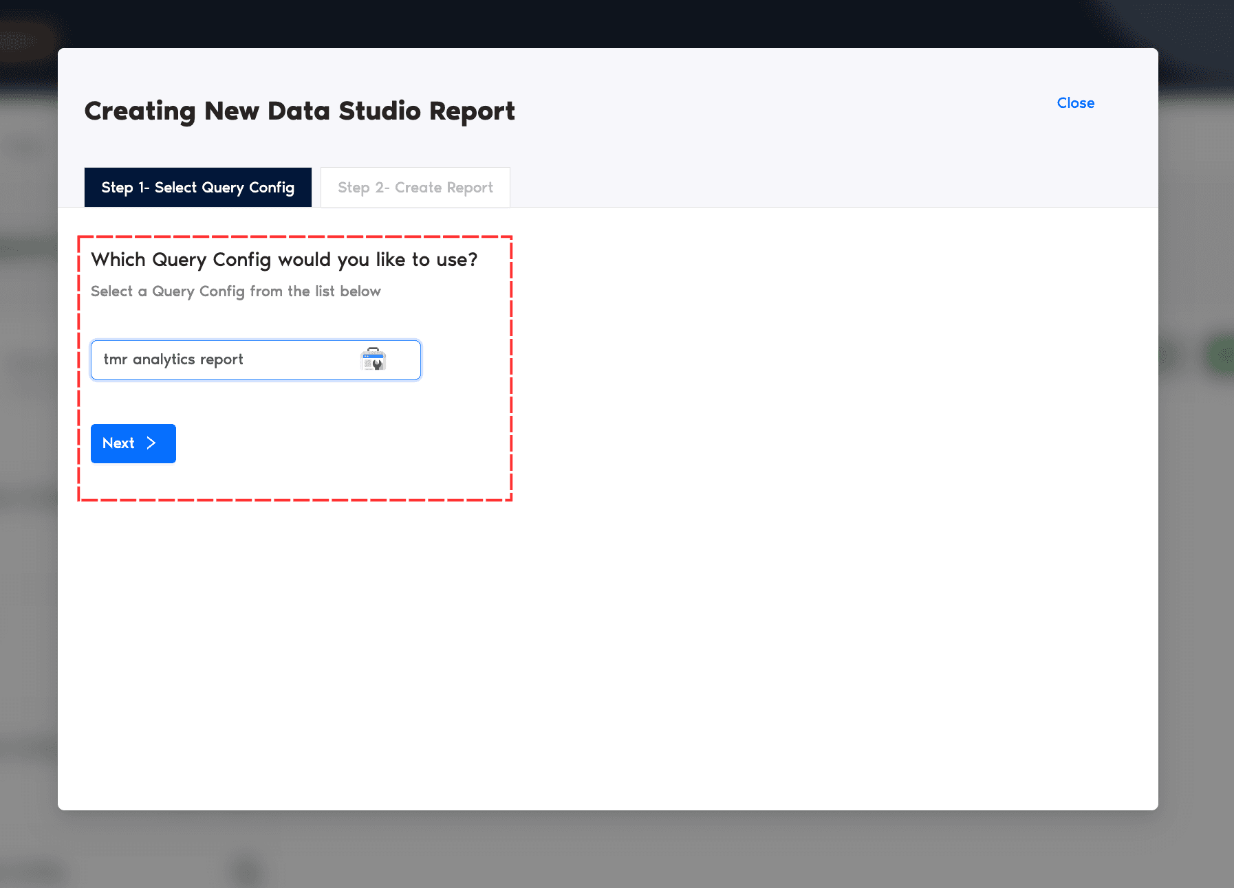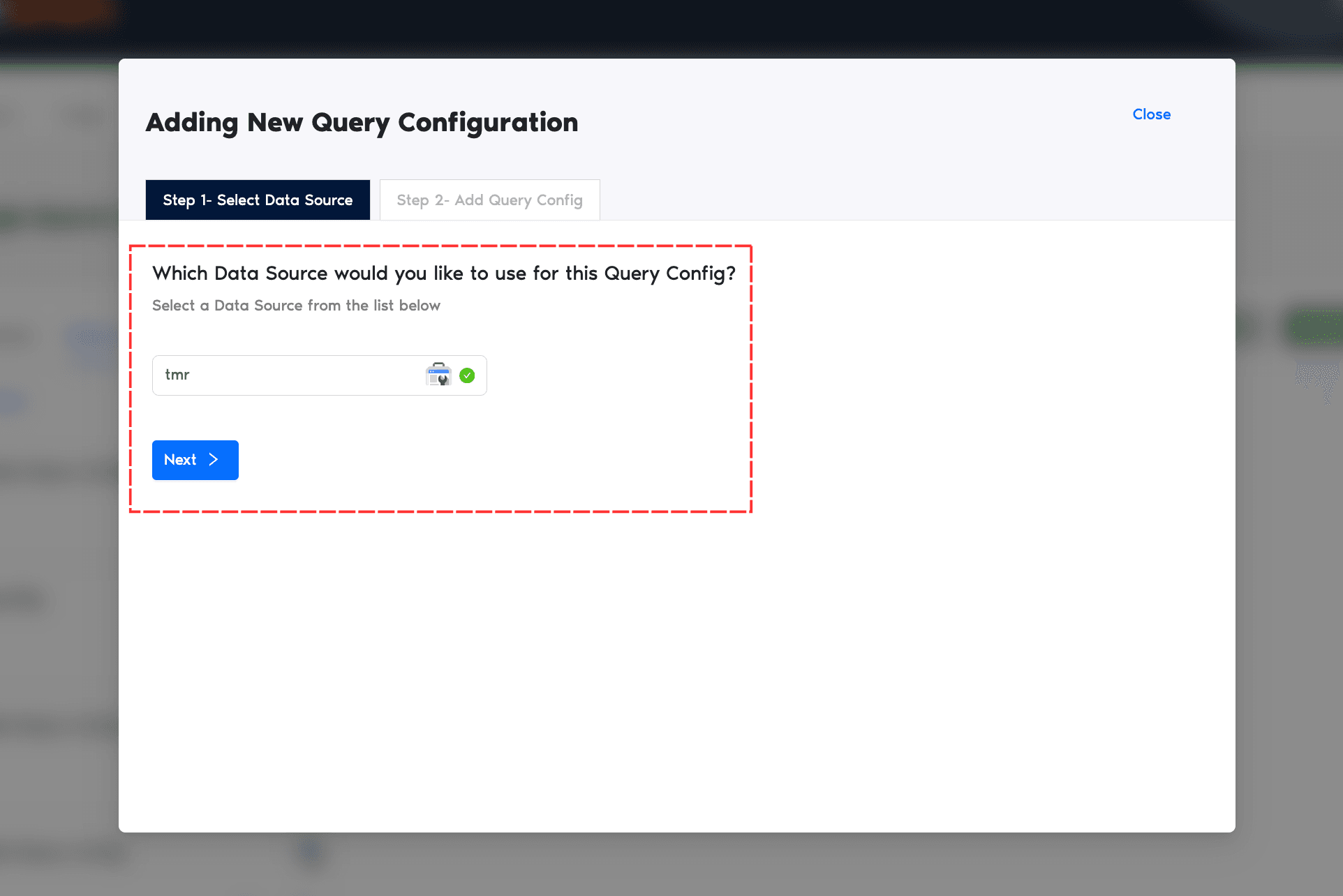 - From this window, select the previously created Query Config from the dropdown and click Next.