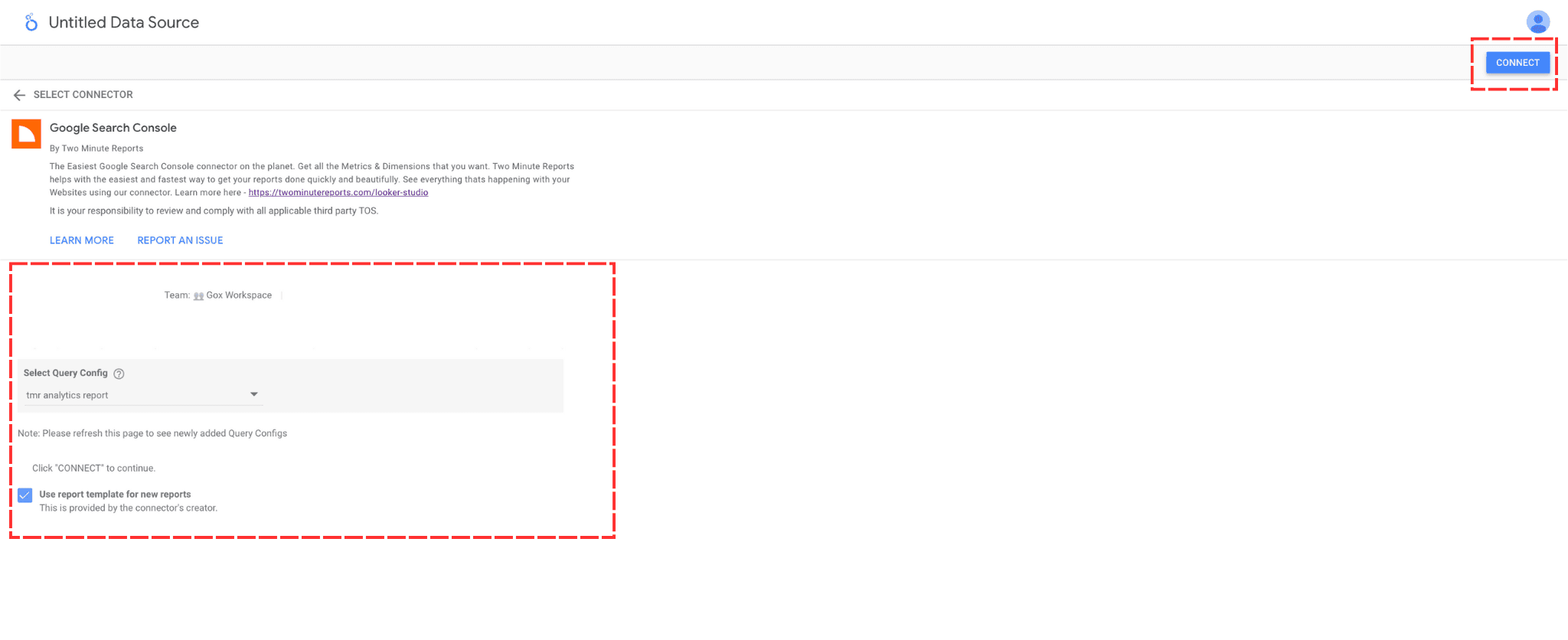 - Once Looker Studio opens, select your relevant team and Query Config for GSC. Ensure that “Use report template for new reports” is checked.