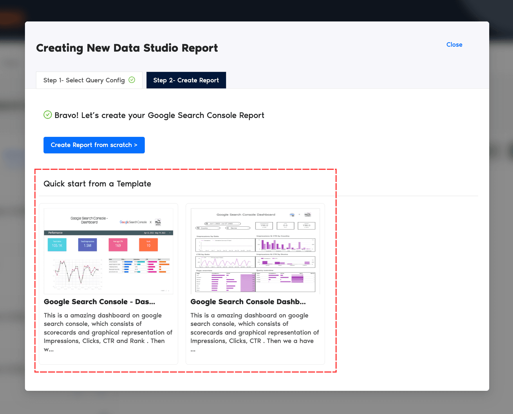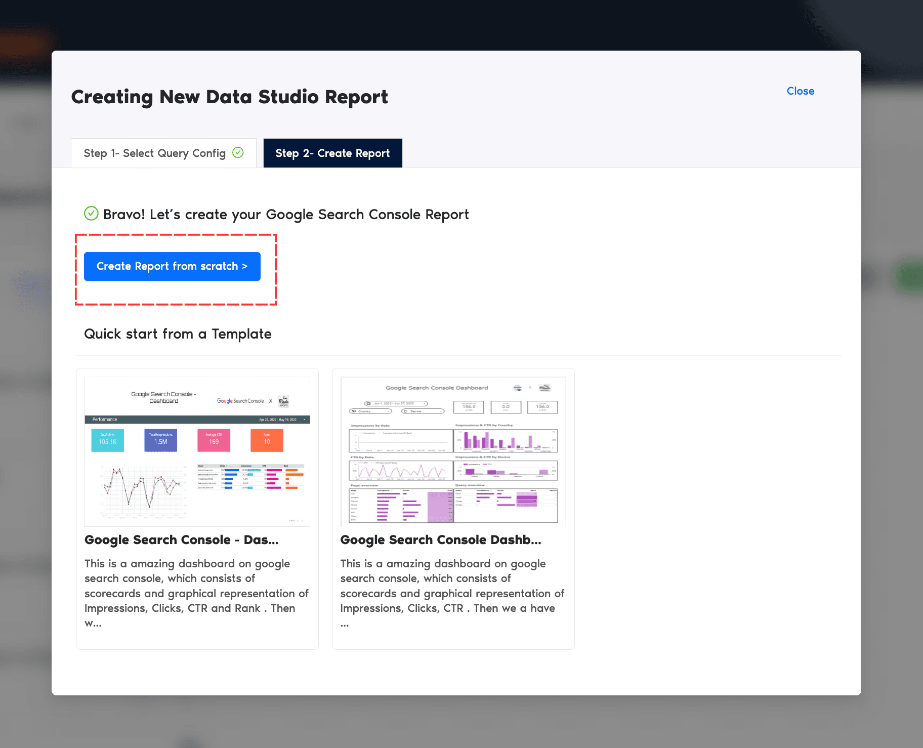 To create a GSC Looker Studio dashboard using templates, follow Steps 1 and 2 from the previous method.
