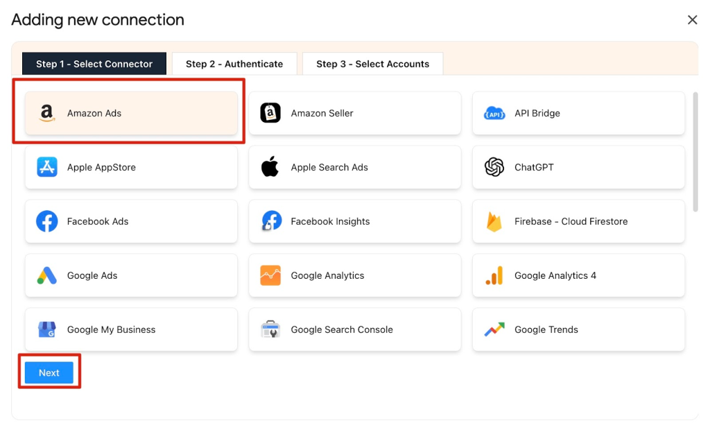 Select Amazon Ads Connector from the list of options. Then, authorize the Connection by entering your Amazon Ads login credentials.