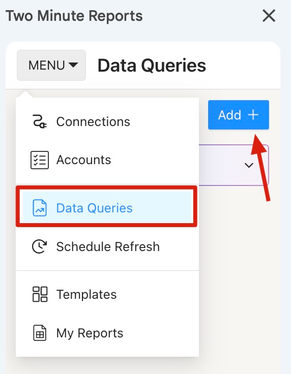 To pull Amazon Ads performance data, go to the Data Queries section and create a new query.Â