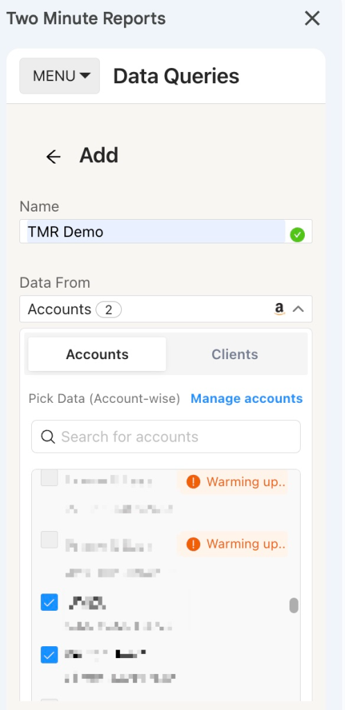 - Enable the accounts you want to run queries for. Once enabled, Speedboost is automatically activated, allowing you to fetch Amazon Ads data within seconds after the Warm-up is complete. Please note that queries cannot be run from accounts that are disabled or still in the Warm-up stage.  Â