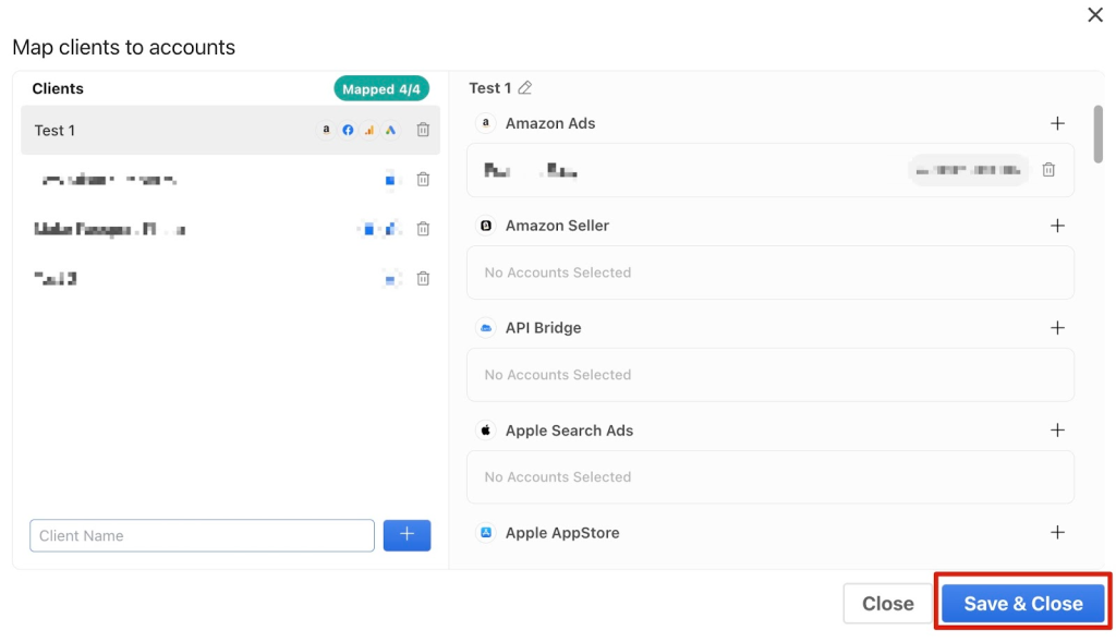 Click Manage Clients and map the required account details. Once complete, click Save & Close to save your client’s information for future use.
