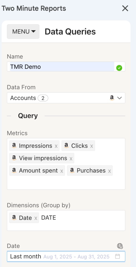 Once done, connect your Amazon Ads account with Two Minute Reports to extract your ad performance data on Google Sheets.