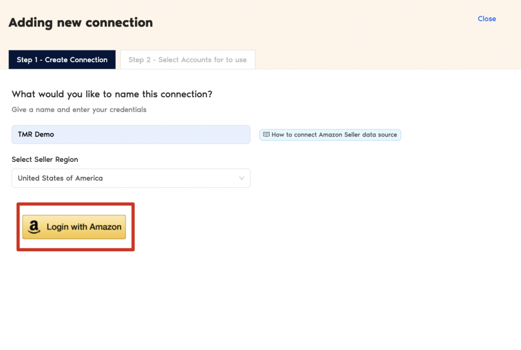 The Adding new connection dialog box appears. Here, you can connect the required Amazon Ads account in two easy steps: