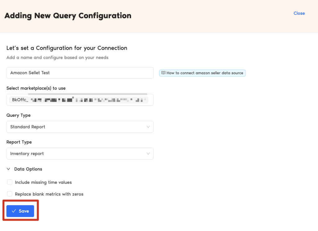 The Adding New Query Configuration dialog box appears. Name the query config, select (from the list of enabled) accounts from the dropdown, and configure your Amazon Seller report. Once done, click Save.