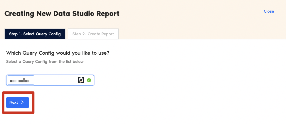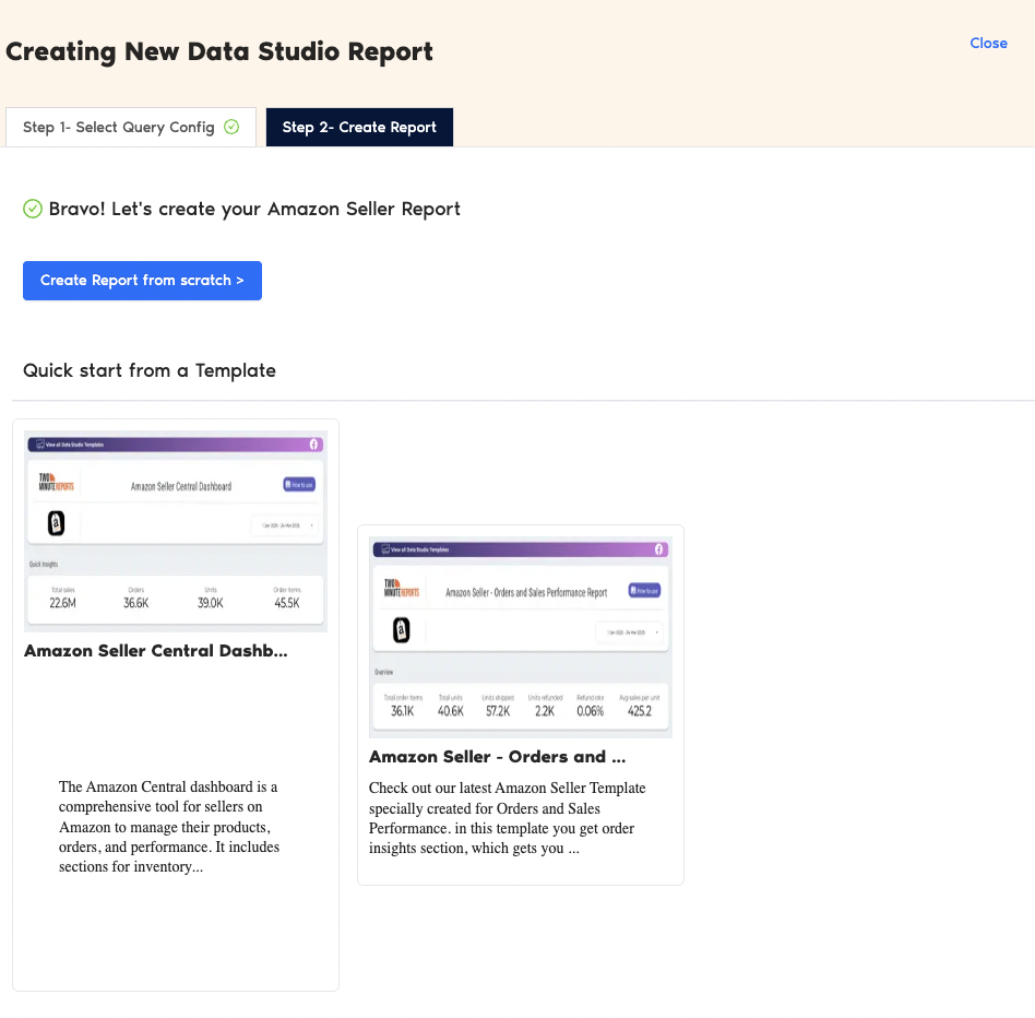 Select the Query Config that you’ve created (in our case, it’s ‘Amazon Seller test’) from the list of options. Click Next and choose ‘Create report from scratch’ to open the Looker Studio dashboard.