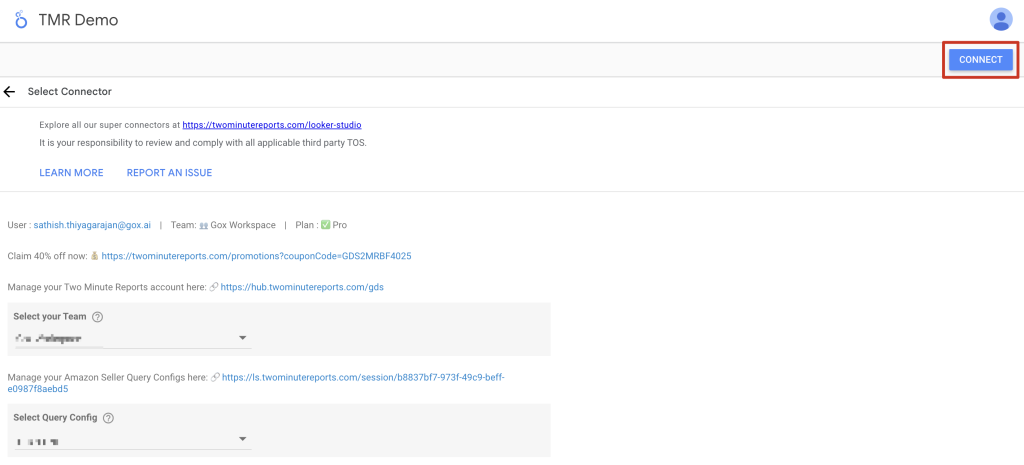 Once the Looker Studio dashboard opens, select your team and the required Query Config from the dropdown. Next, click Connect at the top-right corner.