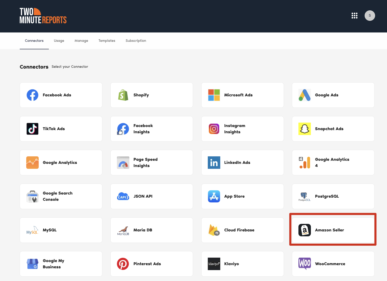 - After clicking Create Report from the previous section, select any of our templates. In this example, click Amazon Seller Central Dashboard.