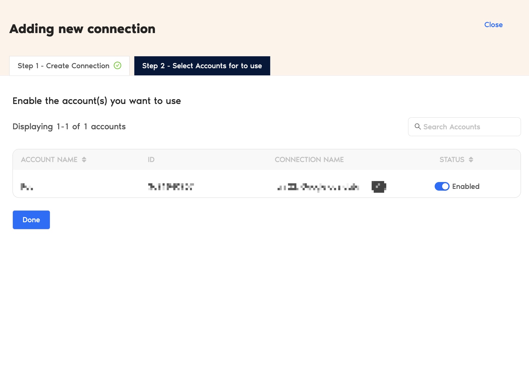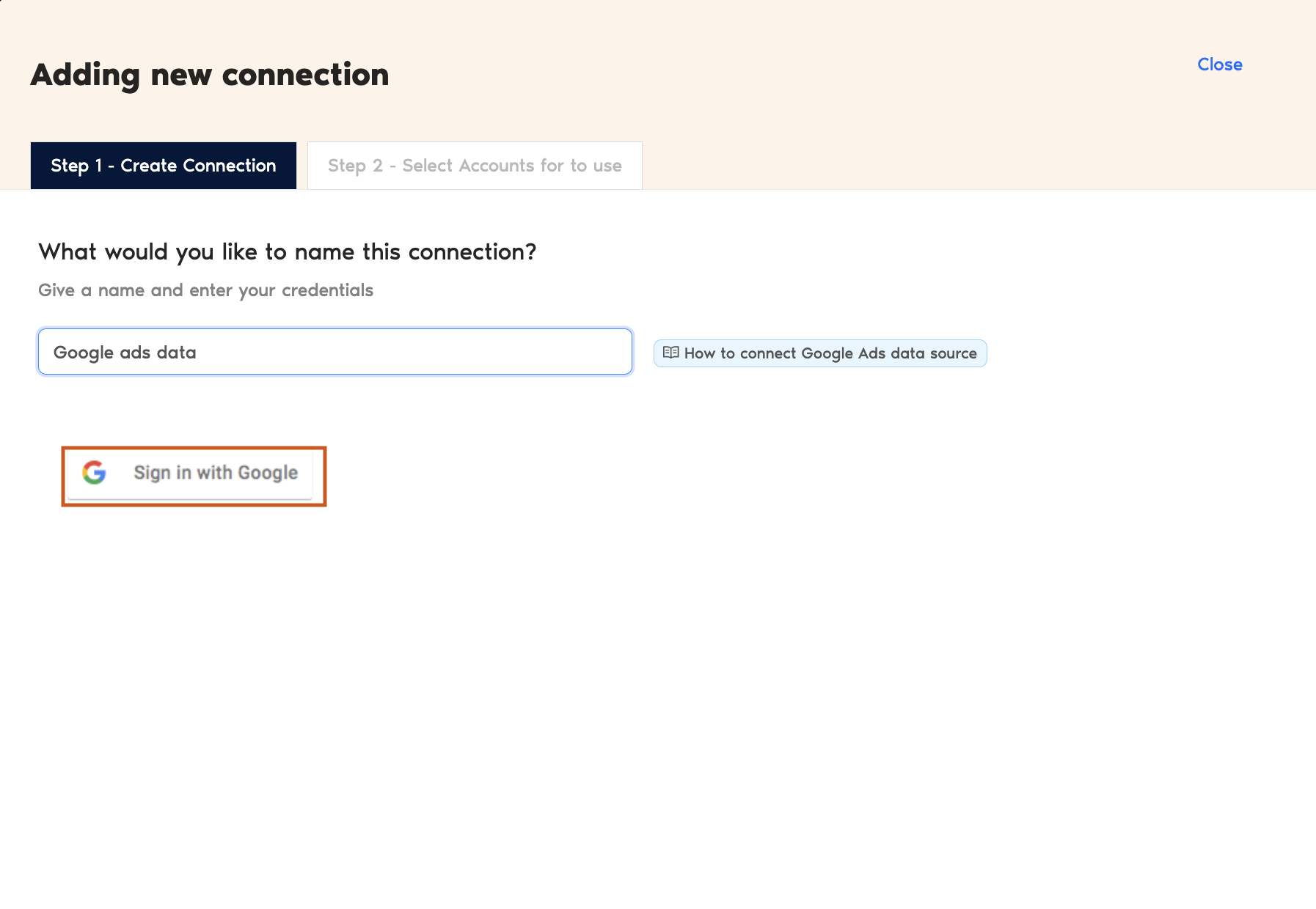 - The Adding new connection dialog box appears. Here, you can connect the required Google Ads account in two easy steps: