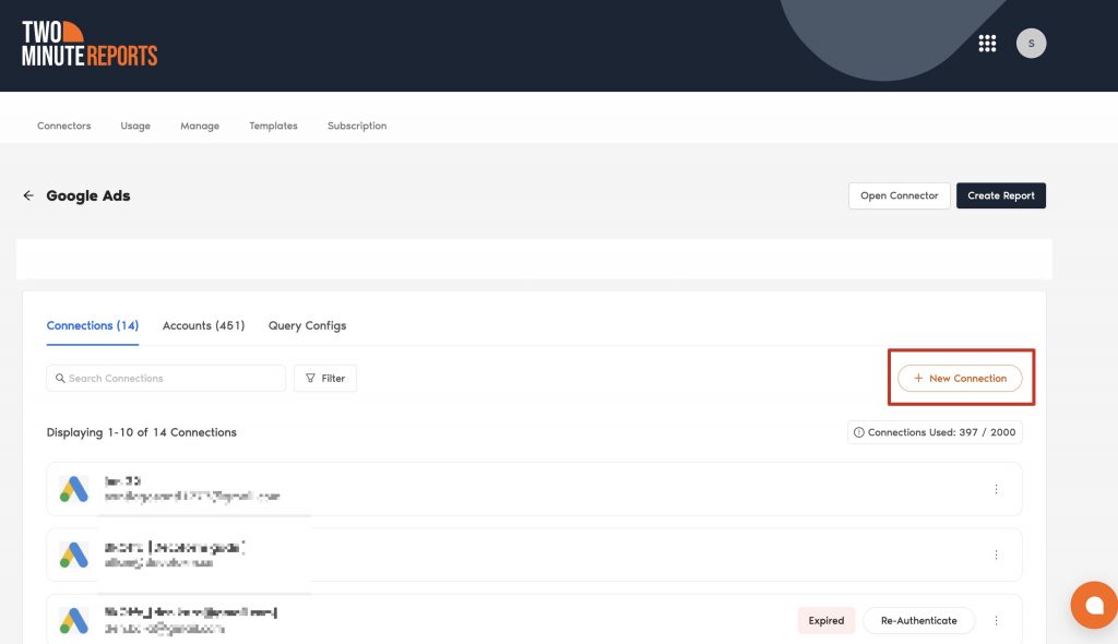 | A Connection is a link between the data source and the Connector. For example, you must use the Google Ads Connector to create a Connection with your Google Ads account to get your ads data. |