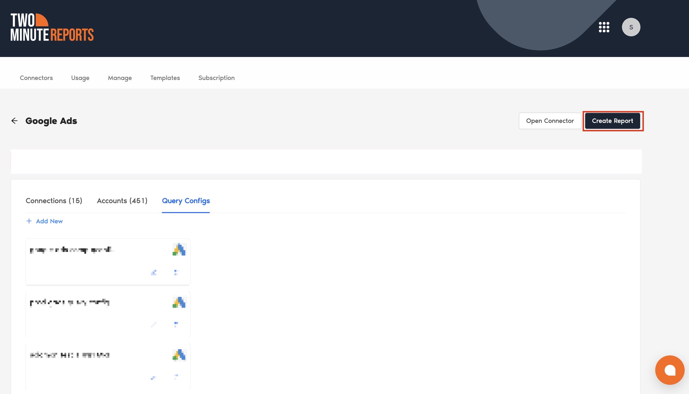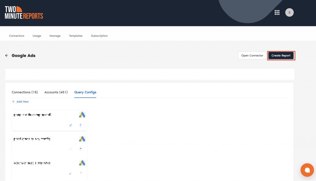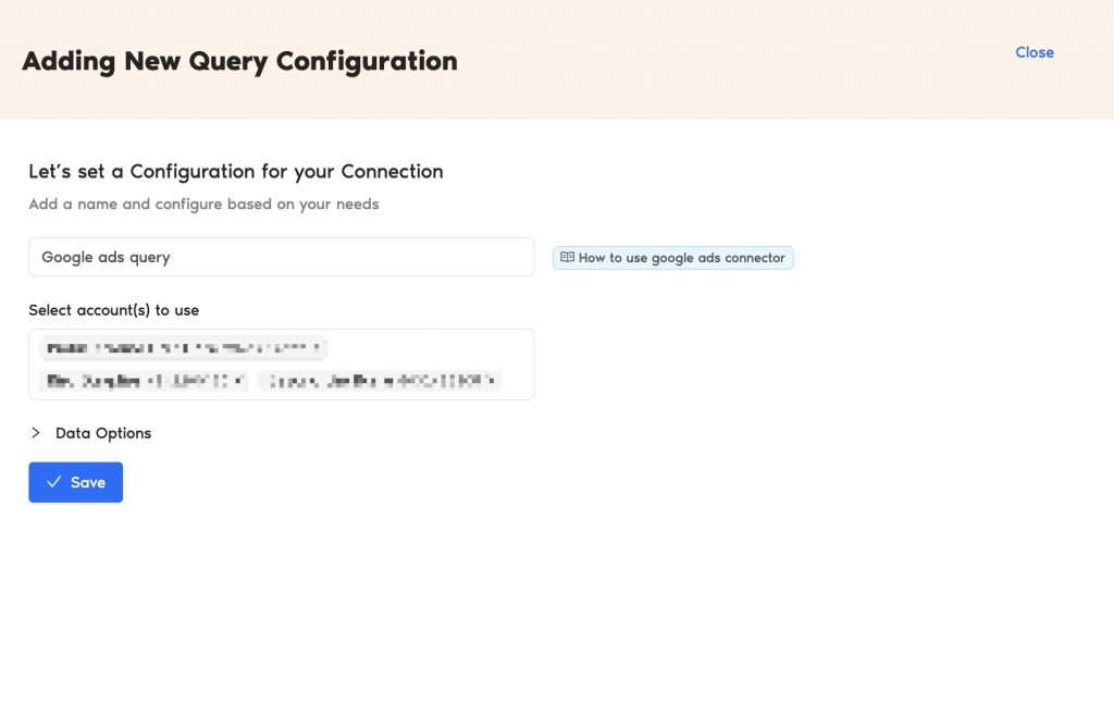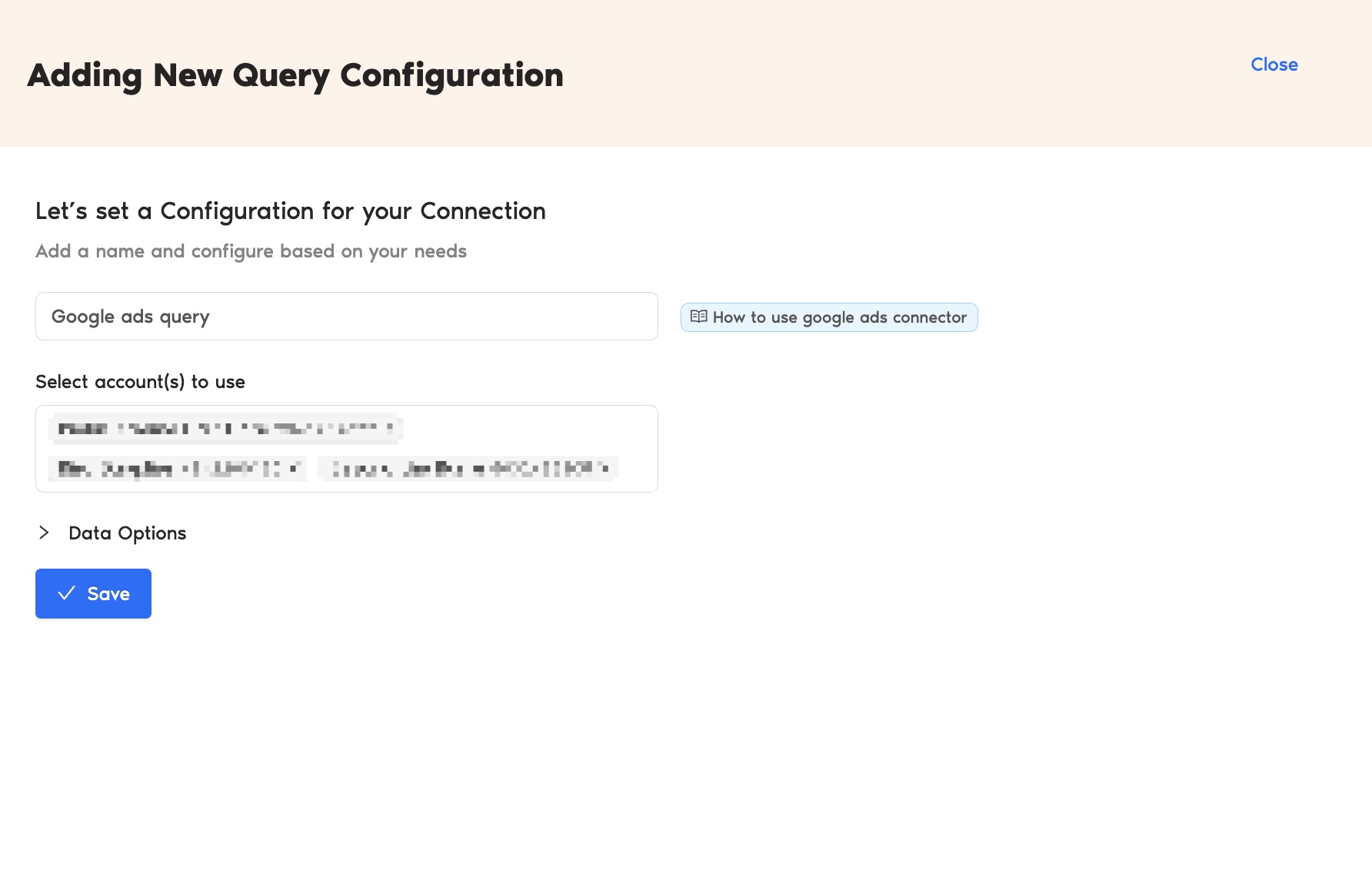 The Adding New Query Configuration dialog box appears. Name the query config, select (from the list of enabled) ad accounts from the dropdown, and configure your Google Ads report. Once done, click Save.