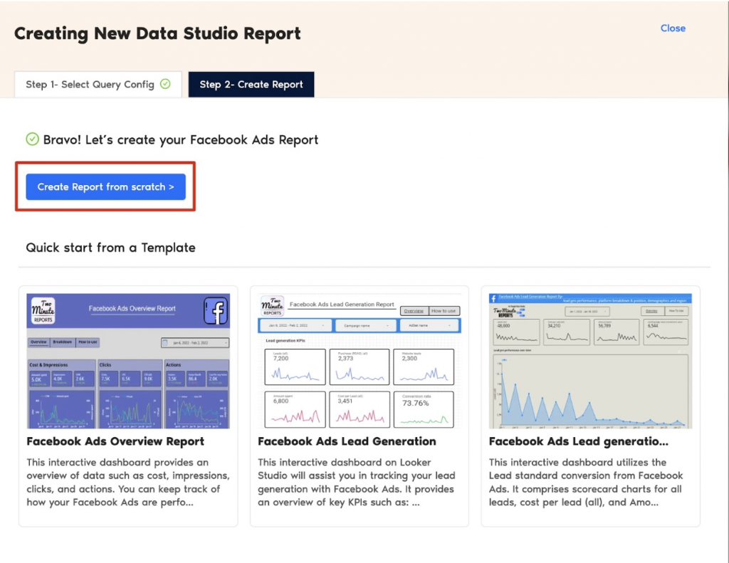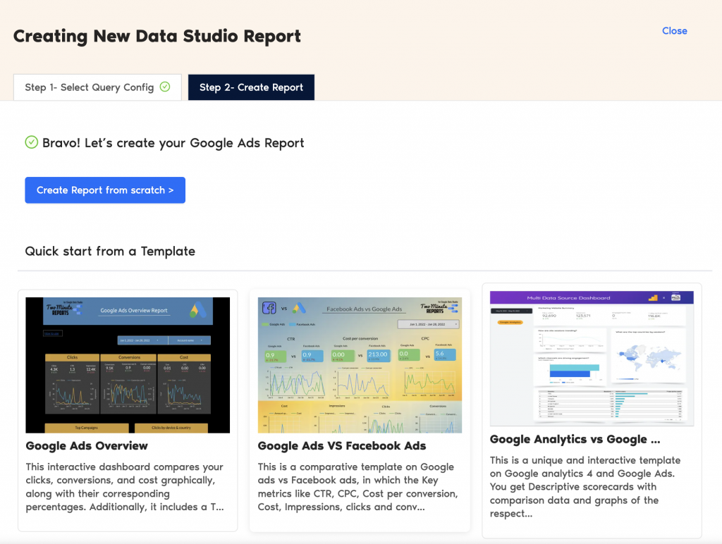 - Select the Query Config that you’ve created (in our case, it’s ‘Google ads query’) from the list of options. Click Next and choose ‘Create report from scratch’ to open the Looker Studio dashboard.