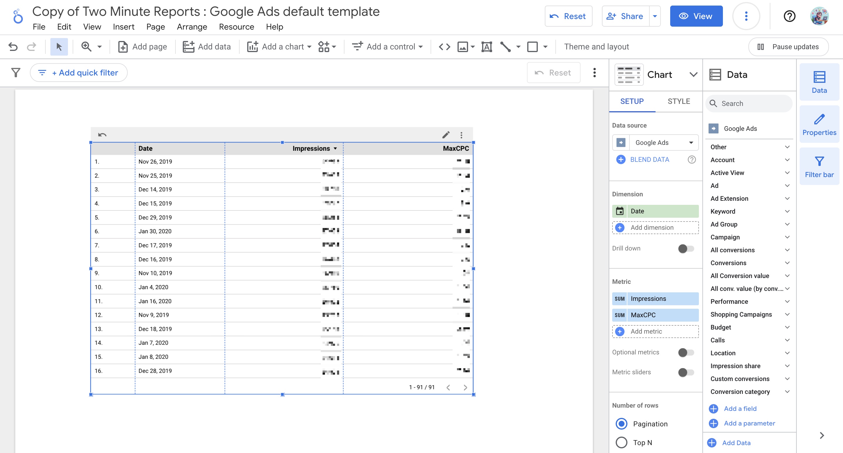 - Once you click Create Report, you’ll be directed to the Looker Studio dashboard. Here, you can drag and drop the associated Google Ads metrics and dimensions to analyze campaign insights faster.