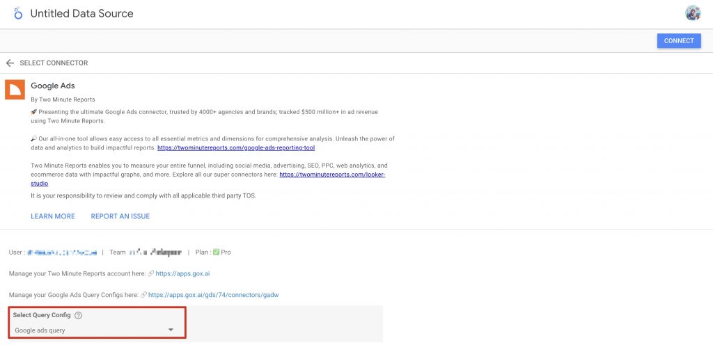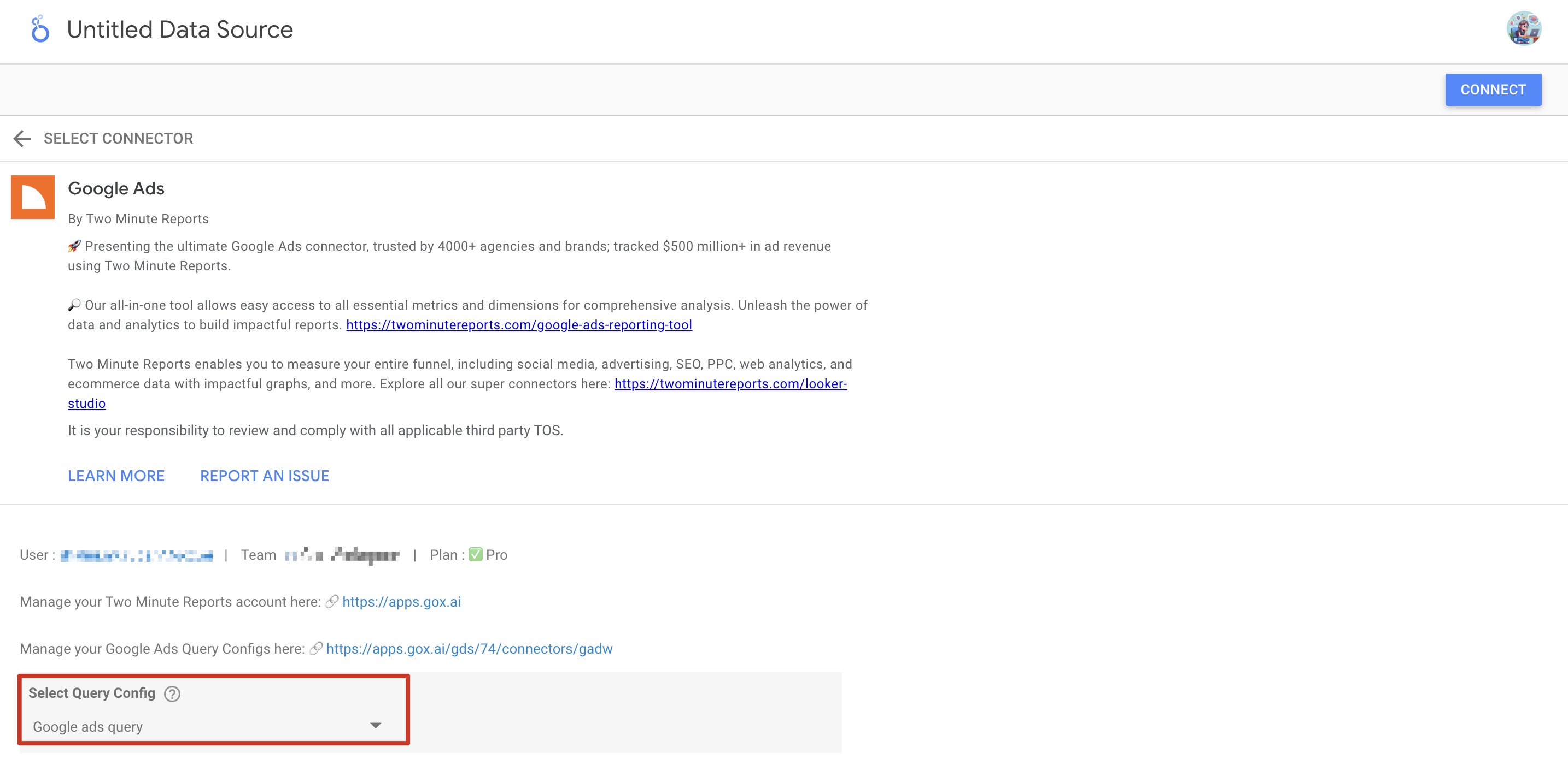 - Once the Looker Studio dashboard opens, select your team and the required Query Config from the dropdown. Next, click Connect at the top-right corner.