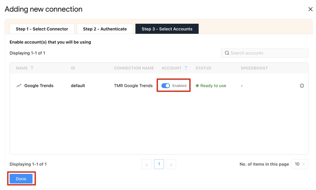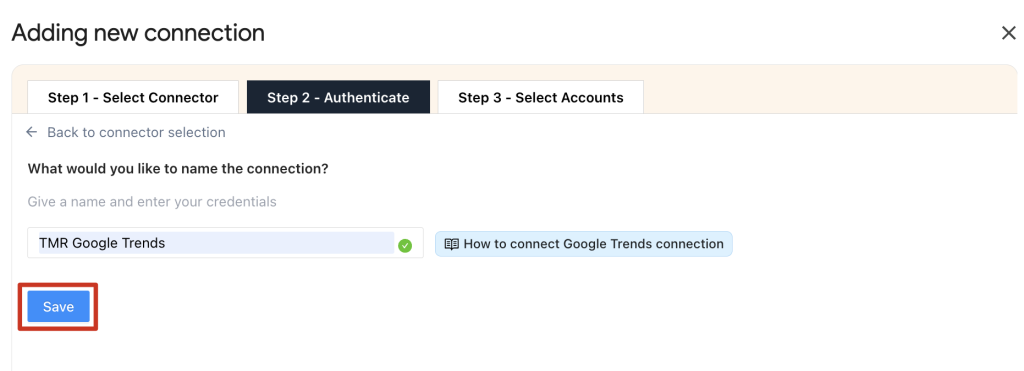 When the “Adding New Connection” dialog box appears, complete the following three key steps to access your Google Trends accounts: