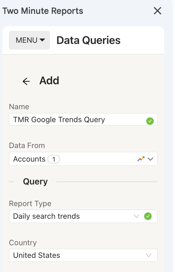 You must create a new query by navigating to the Data Queries section to extract Google trends data.