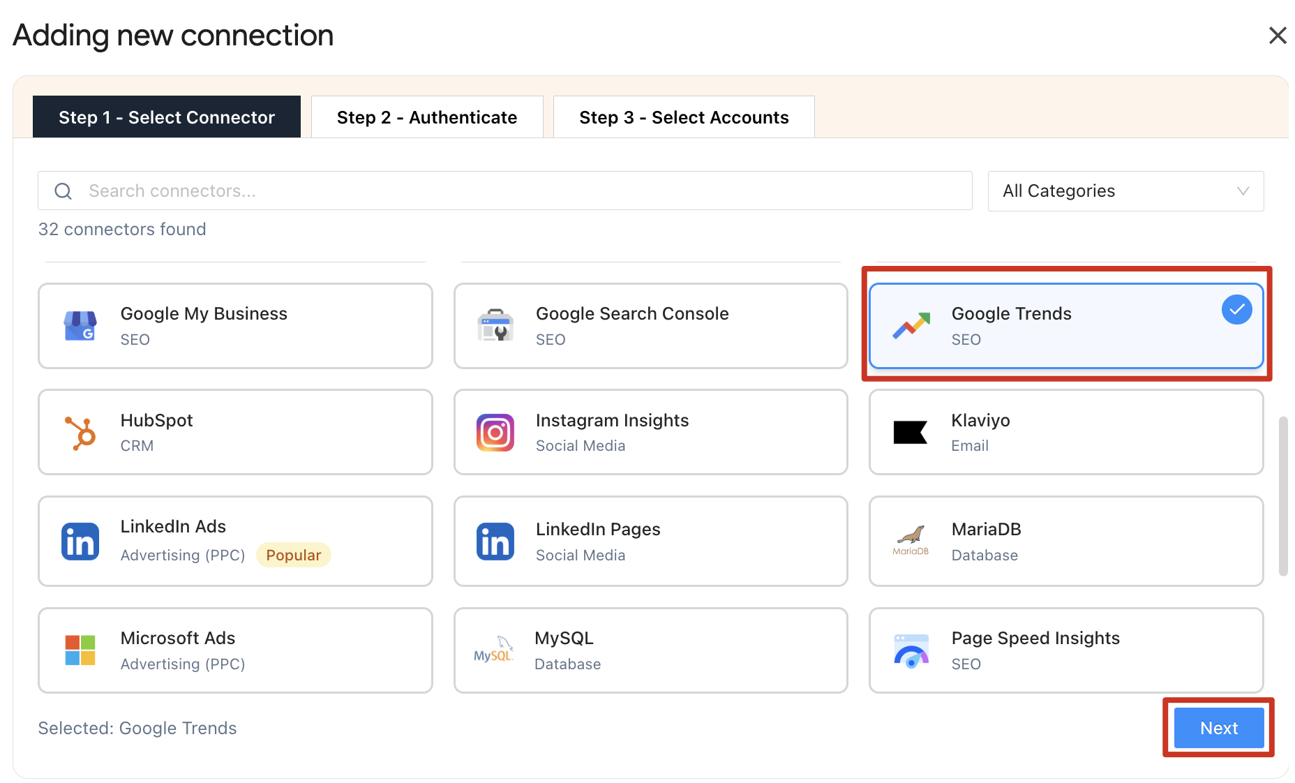 Choose Google Trends from the available options, and authorize the Connection by entering your login credentials.