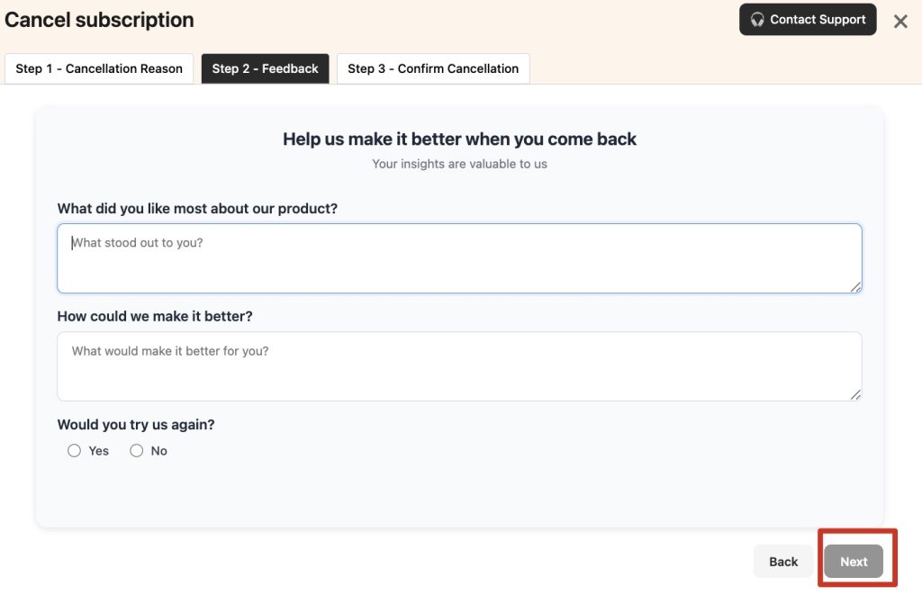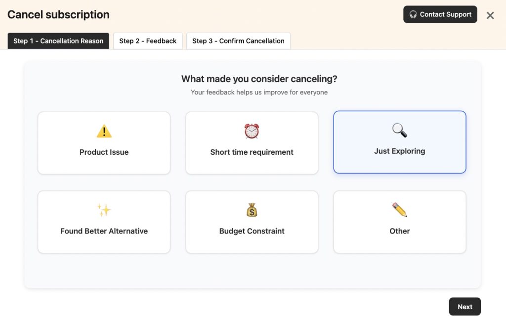 In the Cancel Subscription modal, select a cancellation reason, and then click Next.