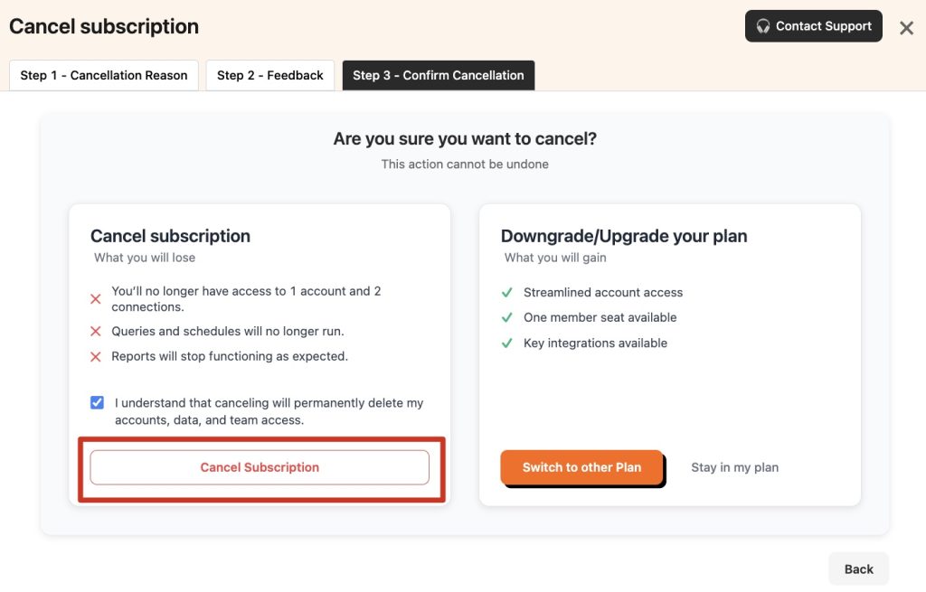 In the final step, review the information provided and click Cancel Subscription.