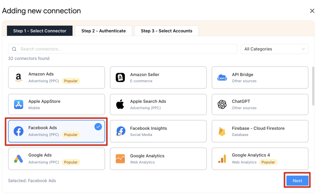 - Selecting the Facebook Ads Connector