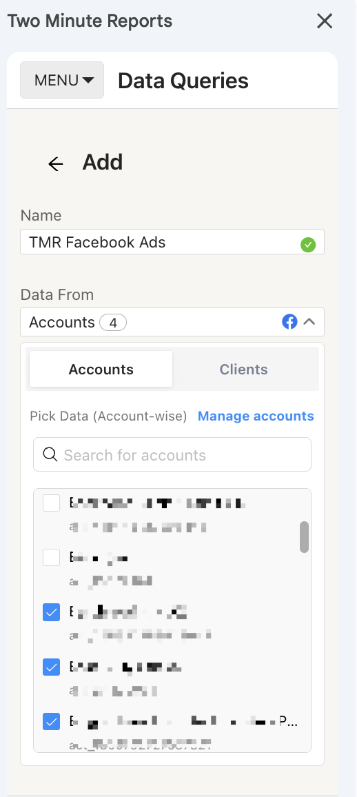 Click Add and choose the respective Facebook Ads accounts to analyze campaign performance. You can manage “n” number of clients’ Facebook Ads accounts under one roof. Simply select one or more accounts to extract actionable campaign insights.