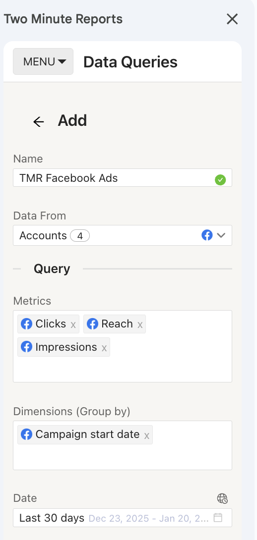 To pull Facebook Ads performance data, you must create a new query by navigating to the Data Queries section.