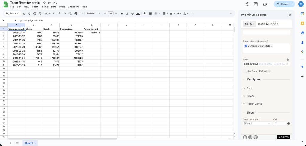 And that’s it. You can now extract Facebook Ads KPIs in Google Sheets to gain actionable insights.