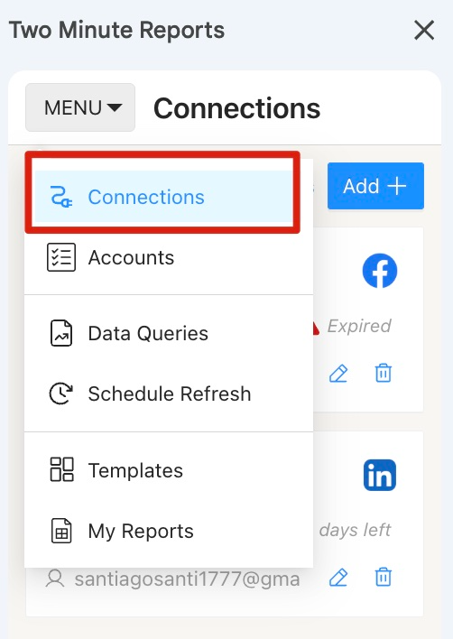 - Click the Menu at the top-left of the sidebar to open the Connections section.
