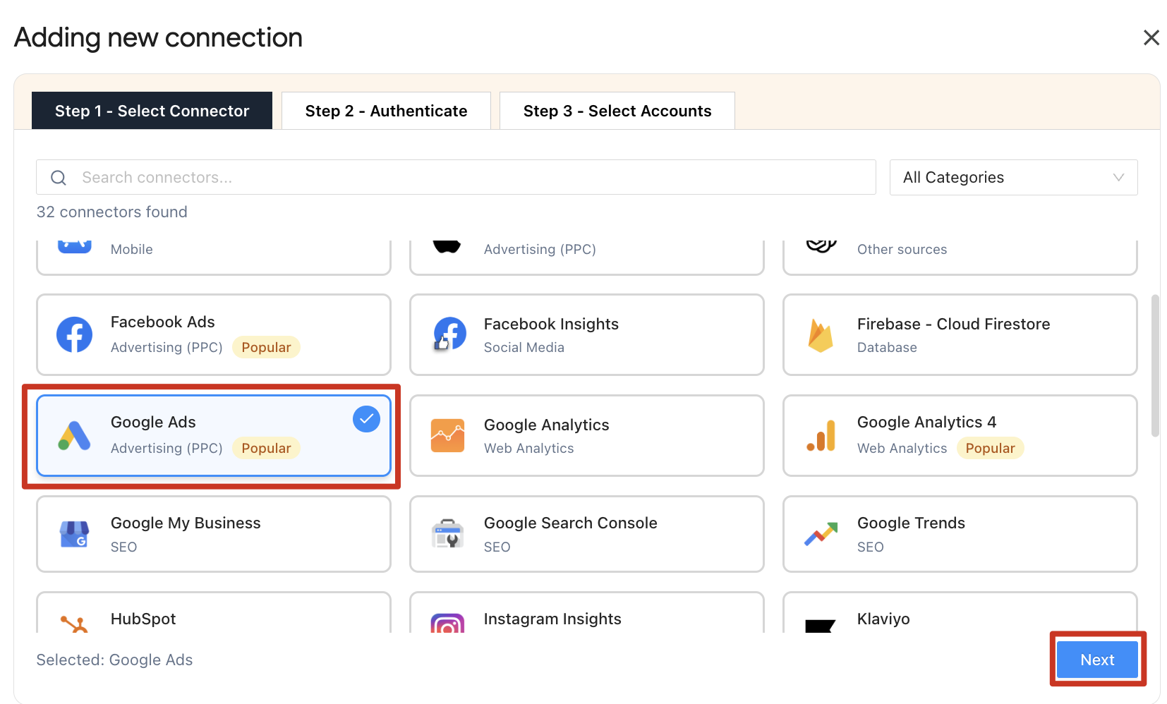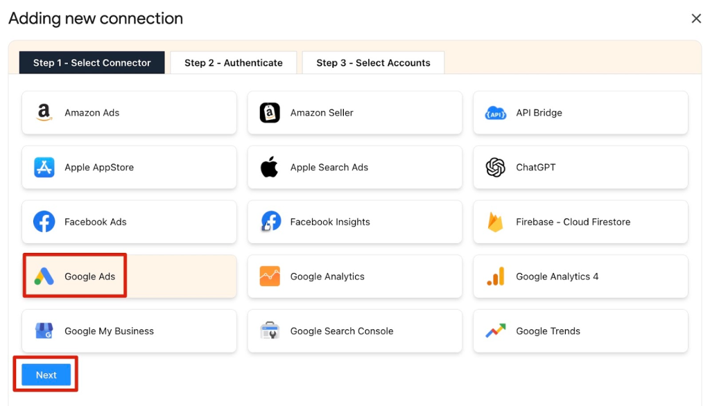 Click Add to create a new connection. A modal will open where you can select Google Ads as your connection type and click Next