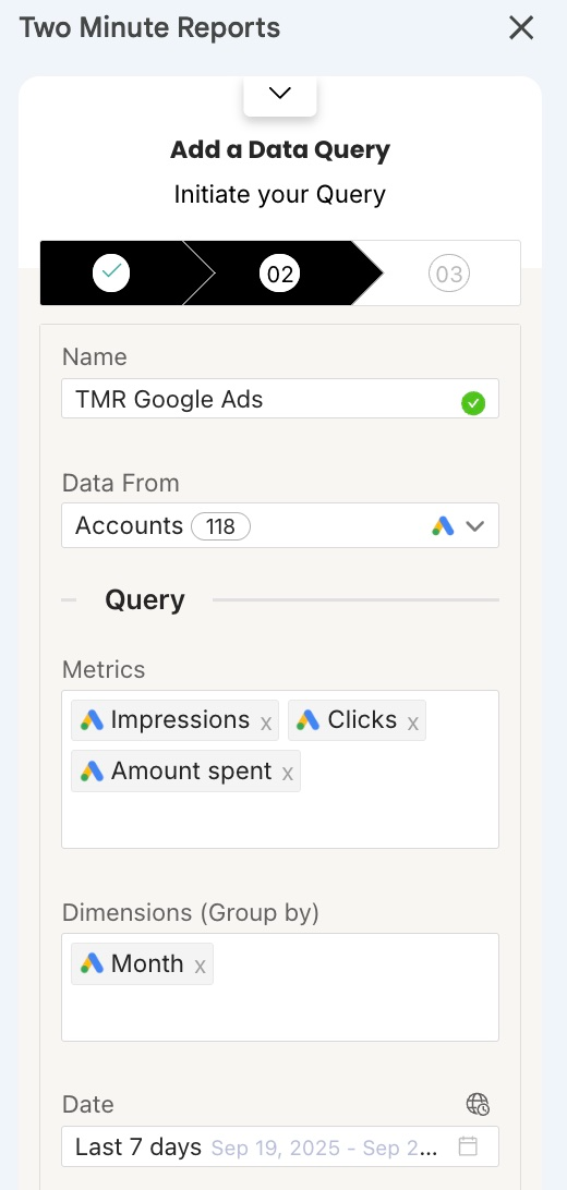 Once done, you can connect your Google Ads account with Two Minute Reports to access your campaign performance insights.