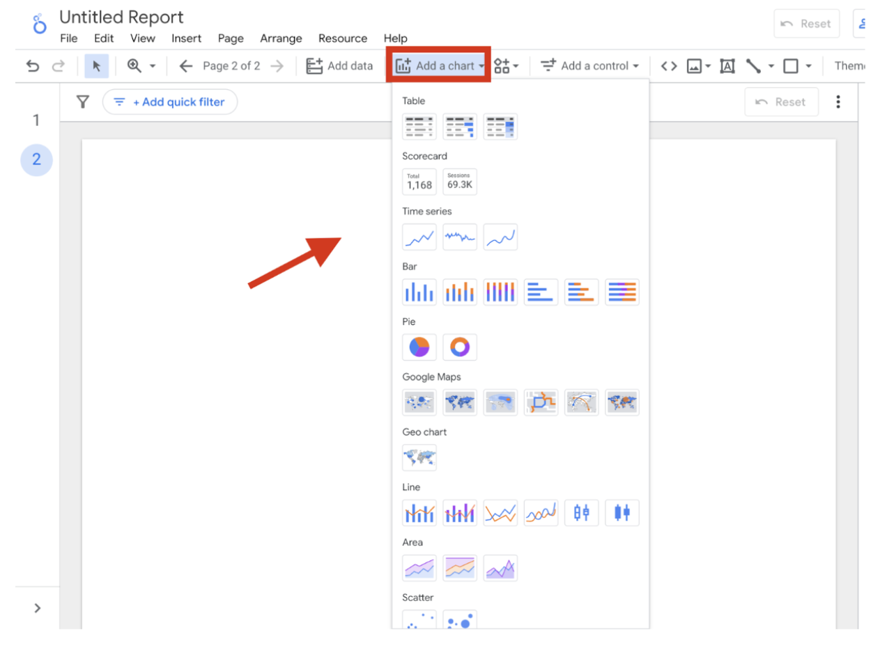 - To enhance your Looker Studio report, use charts and visualizations. Click Add a chart and choose relevant chart types to configure your GA4 dashboard.