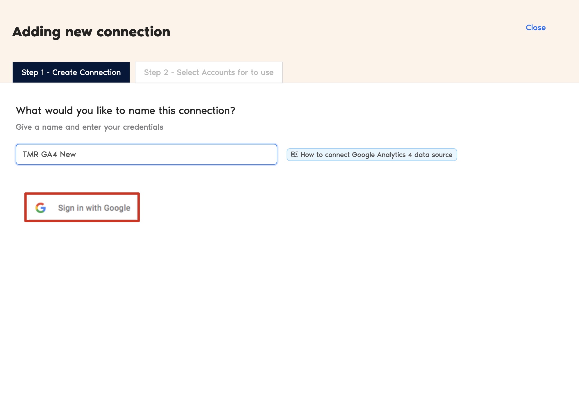 In the Adding new connection dialog box, follow these steps to connect your GA4 data: