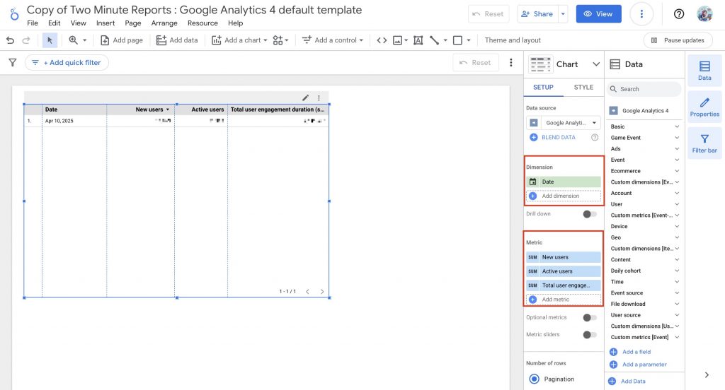 - After clicking Create Report, youâll be directed to the Looker Studio dashboard, where you can drag and drop key GA4 metrics and dimensions to analyze and track performance insights for your website, app, or campaign more efficiently.