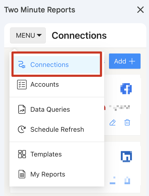 Click Menu at the top left of the sidebar to navigate to the Connections section. Next, click Add to create a new Connection.
