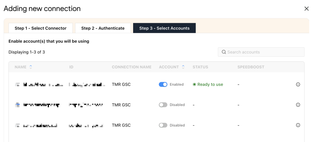 Enable the toggle for the accounts you want to run queries. Please note that you cannot extract data from disabled accounts.