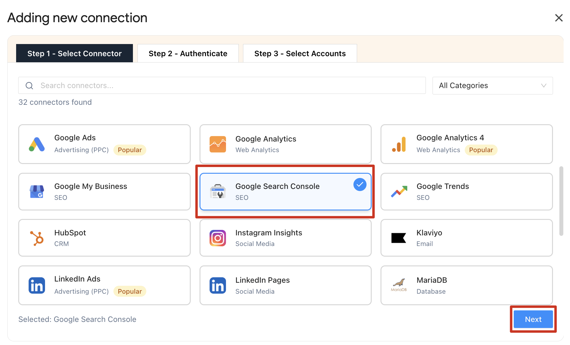 Choose Google Search Console from the list of options, and authorize your Connection by entering your login credentials.